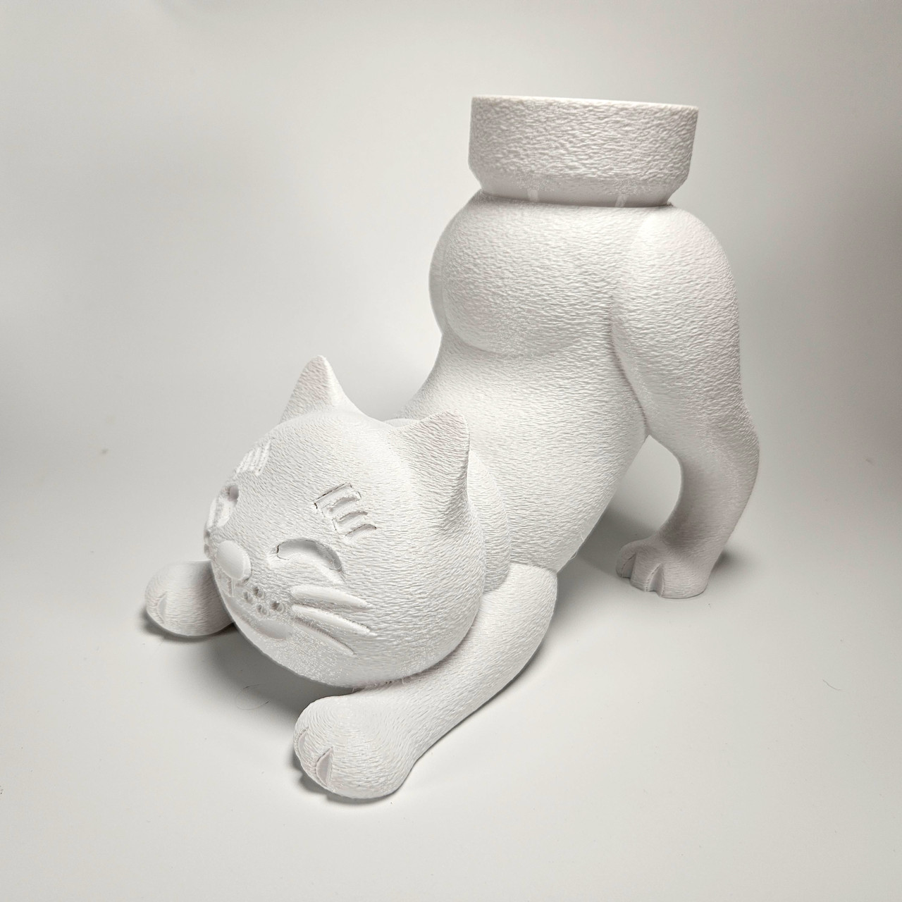 Декоративне кашпо у формі білой кішки, виконаної в позі з піднятим догори задом і опущеною головою, ніби вона потягується. У задній частині фігури розміщений невеликий горщик для кактуса або сукулентів.